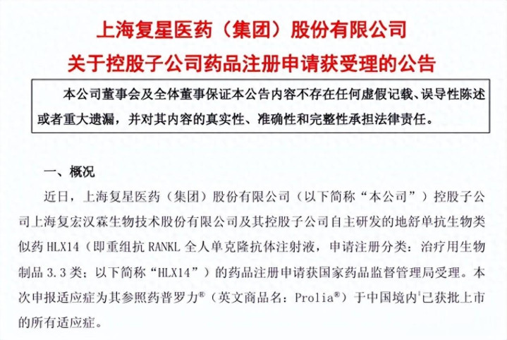 近日火牛网,复星医药发布公告称,控股子公司复宏汉霖的地舒单抗生物类似药HLX14的上市申请获得承办。地舒单抗注射液是影响骨结构及其矿化的药物市场TOP1产品,2025上半年在中国三大终端六大市场的销售额已超过18亿元。地舒单抗注射液是复星医药今年第三款报产的生物药新品。