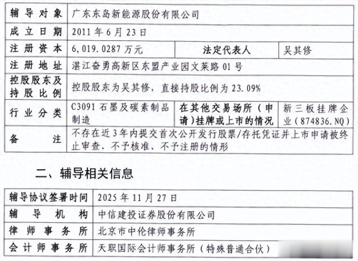 据证监会网站12月5日披露,广东东岛新能源股份有限公司正式启动上市辅导,辅导机构为中信建投证券。