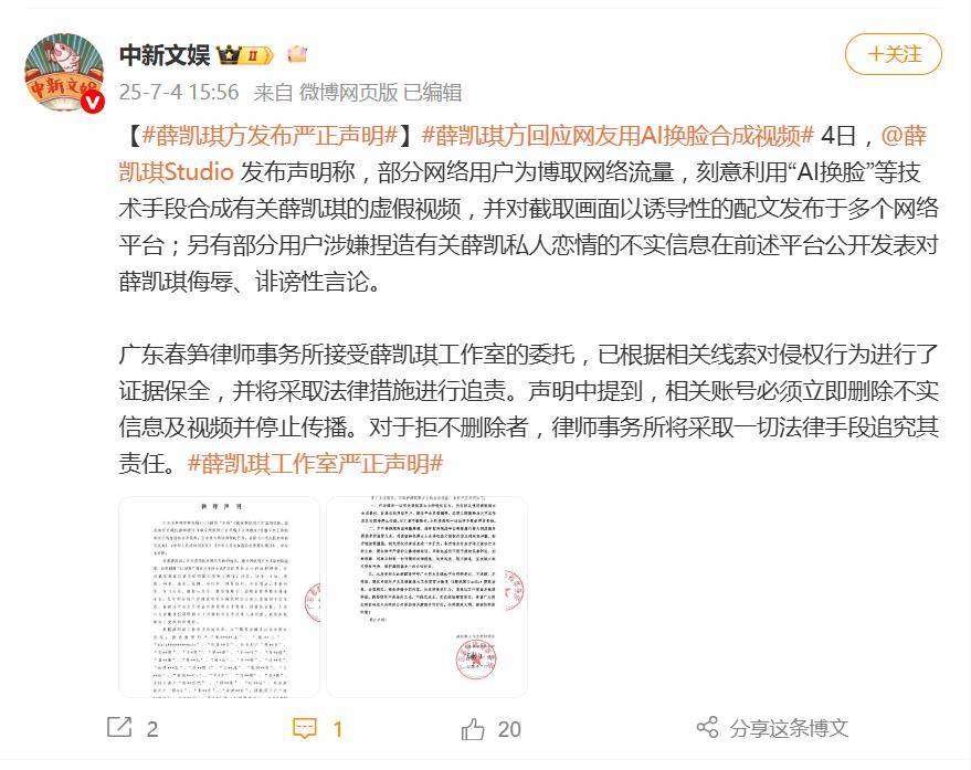 其实早在今年7月4日,薛凯琪工作室就已经打响法律第一枪。一纸声明直接点名32个跨平台账号,指控其利用AI伪造不雅视频并捏造“与黑人富商恋情”等虚假情节。当时工作室就已完成证据保全,并援引《民法典》第1019条及《刑法》相关条款,明示将对拒不删帖者发起民事诉讼乃至刑事报案。