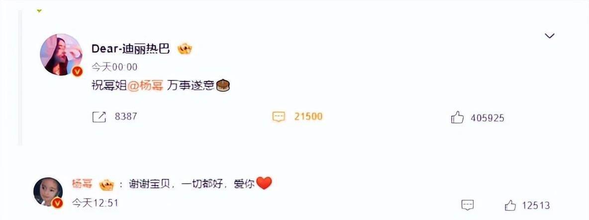 杨幂39岁生日当天,社交平台热闹得像过年!零点刚过,迪丽热巴就迫不及待发文祝福:“祝幂姐万事遂意!”这句简单的话,藏着满满的姐妹情。杨幂秒回:“谢谢宝贝翻翻策略,一切都好,爱你。”这互动甜得让人想磕糖,谁说娱乐圈只有塑料姐妹花?
